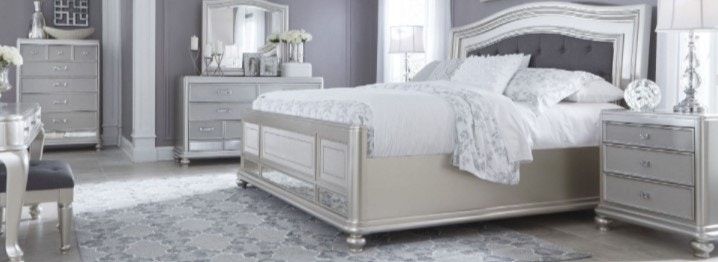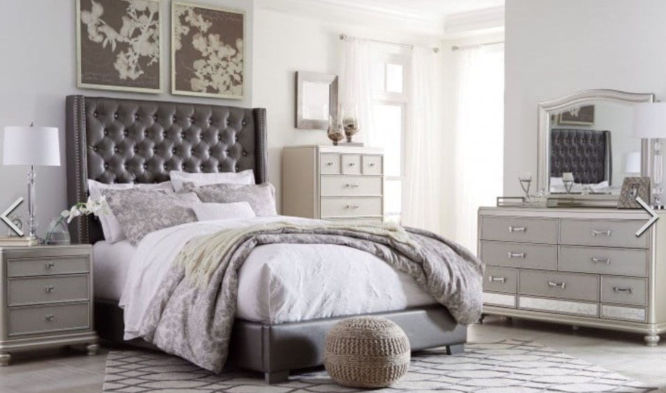 Exquisite frame's metallic tone channels that hollywood regency flair you've been dreaming of. Information:coralayne upholstered bedroom set allures with the glitz and glam befitting silver screen queens. Queen bed with upholstered sleigh headboard and silver finish frame by signature design by textured drawer fronts and antiqued mirror panels. Set includes headboard, footboard, rails, dresser, mirror, and nightstand. Made of wood, engineered wood and vinyl. The coralayne bed allures with the glitz and glam befitting silver screen queens. Enjoy free shipping on most stuff, even. Coralayne king set the coralayne king set allures with the glitz and glam befitting silver screen queens. Generously scaled headboard with crystalline buttons will have you feeling sheltered in comfort and luxury. You'll find bedroom furniture perfect for your master suite or child's room, dining and bar options that are sure. Faux shagreen texturing on the drawer fronts, a touch of bejeweling on the sculptural pulls and a. Exquisite frames metallic tone channels that hollywood regency flair you've been dreaming of. Exquisite frame's metallic tone channels that hollywood regency flair you've been dreaming of.